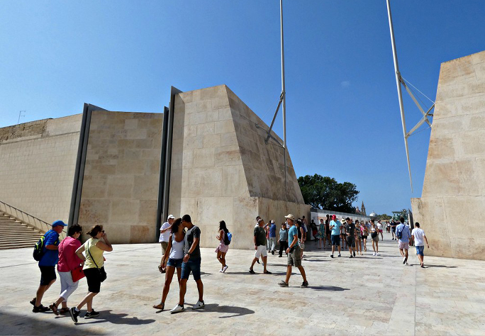 The fourth and last City Gate, designed by architect Alziro Bergonzo and built in the Italian Rationalist style, was commenced in 1964 and completed a year later. The gate which was highly criticised was meant to be part of a regeneration of the space within the gate and the rebuilding of the Royal Opera House, but which never materialised. Instead, a large square was formed to the right, surrounded by a high arcade of a similar style and including numerous shops. In 1998, architect Renzo Piano submitted plans for a new entrance into Valletta but did not materialise. The project was revised in 2008, new plans were submitted and the gate was demolished in 2011. In reality, the new gate is just 8 meters wide, a breach, which is supposed to compress movement during the crossing.
