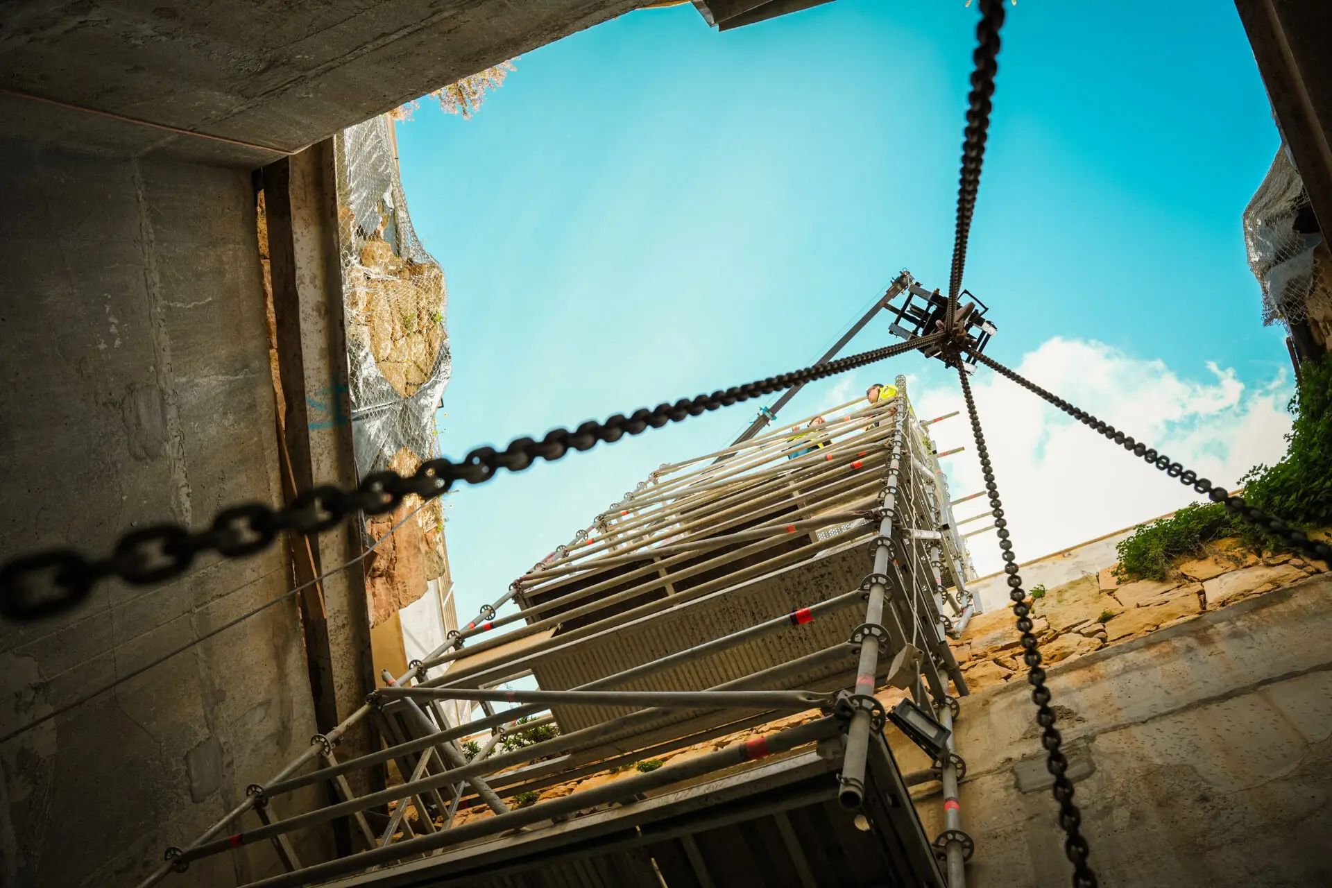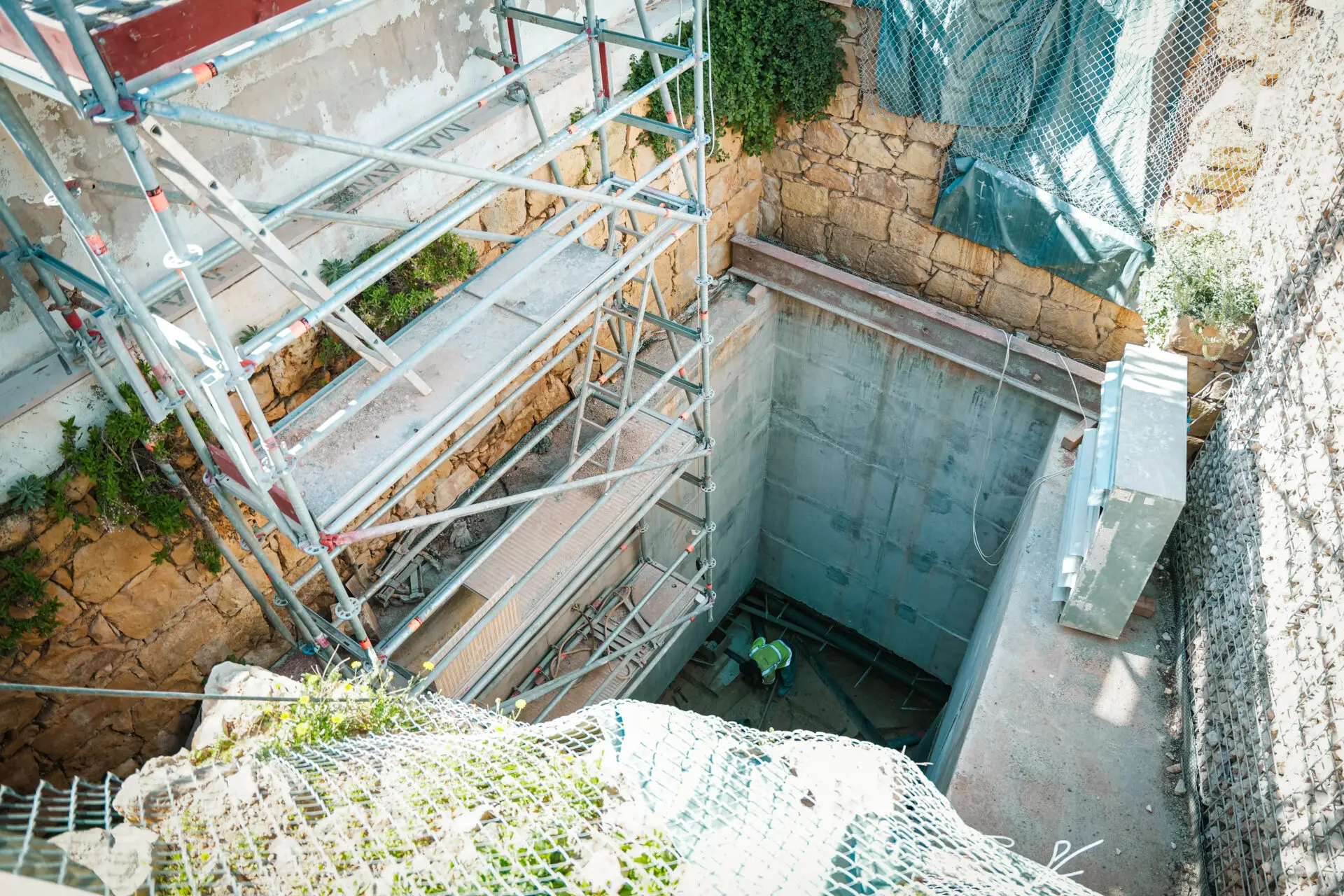 The first phase comprised in extending the excavation of an existing pit at Peacock Garden level. This entailed the removal of existing soil level and recovery of archaeological artefacts. Throughout this process, an array of stainless-steel rods was driven into the existing soil and rock to increase structural sturdiness while seven annular beams were constructed to withstand existing forces. Once this phase was completed, the underlying rock was diligently excavated to the required level and size to form the vertical lift shaft. In conjunction, a twelve-meter tunnel was excavated to enable a horizontal connection between the ferry area and the vertical access.